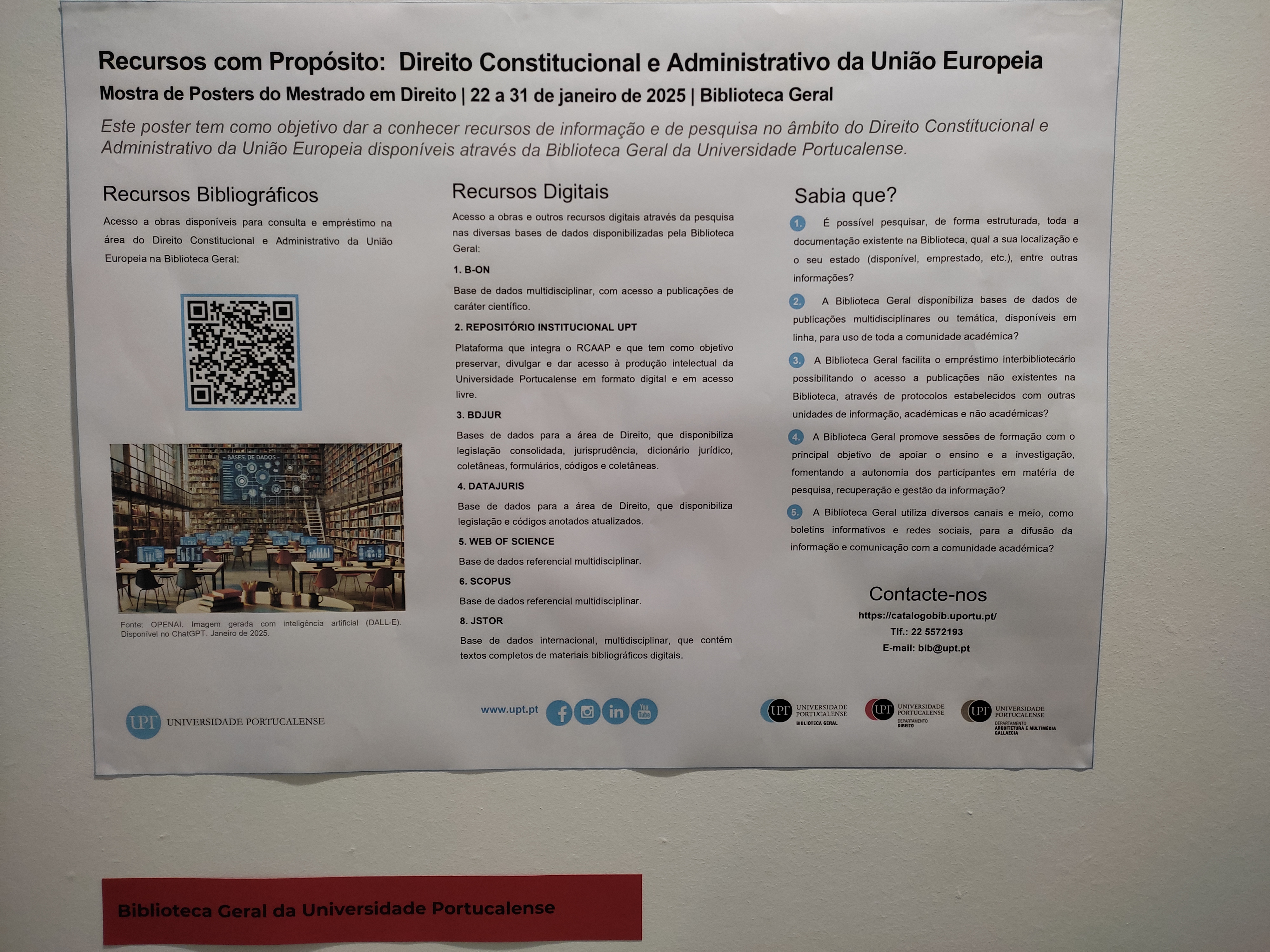 UPT, Biblioteca Geral (2025). Recursos com Propósito: Direito Constitucional e Administrativo da União Europeia [poster]. Mostra de Posters do Mestrado em Direito. Universidade Portucalense Infante D. Henrique, Porto, Portugal, 22-31 de janeiro 2025. Repositório Institucional UPT. https://hdl.handle.net/11328/6748