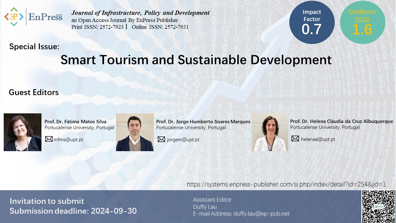 Silva, F. M., Marques, J. & Albuquerque, H. (Eds.) (2024). Smart Tourism and Sustainable Development. Journal of Infrastructure, Policy and Development, (Special issue), 1. Repositório Institucional UPT. https://hdl.handle.net/11328/5340